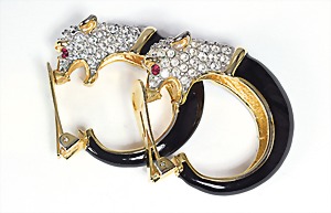 Brosche "PANTHER", goldfarben, signiert: VOGUE BIJOUX, schwarzes Emaille mit klaren Strasssteinen besetzt, vollplastisch schön ausgearbeitet, ca. 52,5 x 33,5 mm