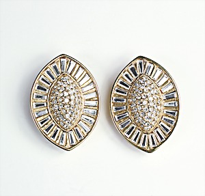 Ohrclips in Navette-Form, goldfarben, sig.: St. John (USA), üppig besetzt mit klaren Baguette- u. runden Strass-Steinen, ca. 35,5 x 26,5 mm