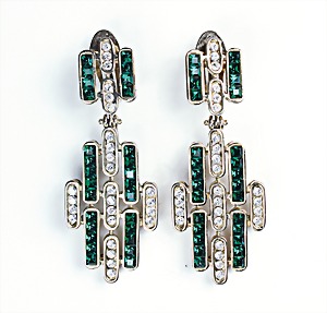 Auffällig große Strass-Ohrclips im "ART-DECO" Stil, goldfarben, unsig., grüne Carré-Steine u. klarer Strass, beweglich, H = 67,5 mm