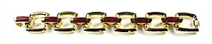 Armband von "CLARINS", goldfarben, sig.: CLARINS PARIS, große quadratische Glieder mit rötlichen Lucite Bindegliedern, L = 18,5 cm, (orig. Beutel)