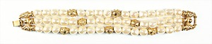 Armband "FRANKLIN MINT", goldfarben, sig.: FM, 3-reihige Kunstperlen mit goldfarbenen, granulierten Zwischenteilen, dekorative Schließe, L = 22 cm, (original Verpackung !)