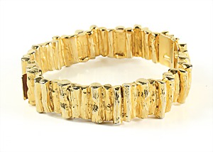 Armreif "KENNET JAY LANE", goldfarben, signiert: K. J. L., aneinandergereihte Ast-Stäbchen, Kastenschloss, innen ca. 58 x 52,5 mm, (Reif mit Federspannung im Scharnier !)