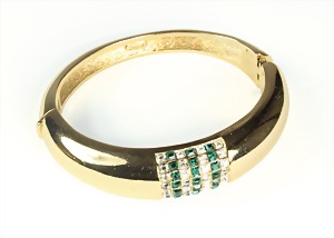 Armreif "HENKEL & GROSSÉ" Pforzheim, goldfarben, sig.: Grossé, mittig besetzt mit grünen u. klaren Carré-Strasssteinen, Kastenschloss mit Scharnierbewegung, B = 15,2 mm (oben), nach unten verjüngend, innen: ca. 56 x 49,5 mm