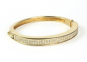 Armreif "HENKEL & GROSSÉ" Pforzheim, goldfarben, sig.: Grossé, mittig besetzt mit klaren Strasssteinen, Schnappschloss mit Scharnierbewegung, B = 7,3 mm, innen: ca. 56,5 x 49,8 mm