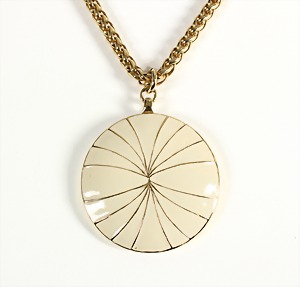 Collier "TRIFARI" USA, goldfarben, sig.: TRIFARI, Anhänger mit cremefarbenem Emaille, fein strukturierte Linien, D = 47 mm; kräftige Zopf-Kette ca. D = 4,7 mm mit Knebelverschluss, L = 44 cm