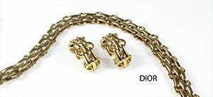 Lot: Collier/Kette u. Ohrclips von "DIOR", goldfarben, sig.: Chr. Dior GERMANY, Kette (mit Verlängerungs-Kettchen) L = 41,5 - 46,5 mm; Ohrclipse im gleichen Stil ca. 26,5 x 13 mm (Gebrauchsspuren)