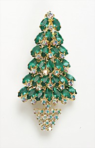 Weihnachtsbaum-Brosche USA 1950/60er Jahre, goldfarben, signiert: WEISS; opalisierende Strasssteine mit grün/facettiertem Glas in Navette-Form, ca. 78 x 39,5 mm