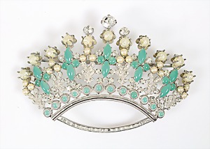 sehr große Brosche "KRONE", USA 1950/60er Jahre, weißfarben, signiert: WEISS; grüne Glasssteine (rund u. Navette-Form), weißer Strass, weiße Kunstperlen, ca. 108,3 x 71,5 mm