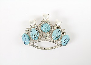 Brosche "KRONE", USA 1950/60er Jahre, weißfarben, signiert: WEISS, türkisfarbene Glascabochons, weißer Strass, weiße Kunstperlen in Herzform, ca. 72,5 x 55,5 mm, ausgefallen !