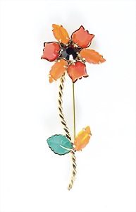 Brosche "BLUME", USA 1950/60er Jahre, goldfarben, signiert: WEISS; orangefarbene, gravierte Blütenblätter, zentraler dkl. Strassstein, grün/orange gravierte Blätter, ca. 86 x 33,5 mm
