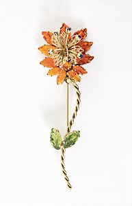 Brosche "BLUME", USA 1950/60er Jahre, goldfarben, signiert: WEISS; orangefarbene Blütenblätter (graviert) mit einem Kranz dunkler Strasssteinen, 2 gravierte grüne Blätter, ca. 104 x 36 mm