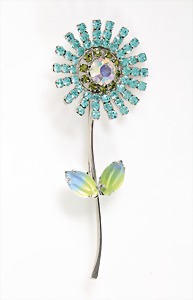Brosche "BLUME", USA 1950/60er Jahre, weißfarben, signiert: WEISS; zentral: opalisierender Strassstein, türkis u.grüne Strasssteine, grüne Blütenblätter, ca. 108,5 x 42,3 mm
