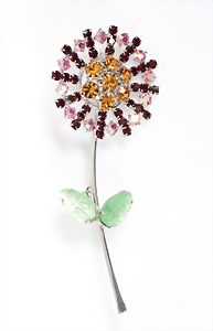 Brosche "BLUME", USA 1950/60er Jahre, weißfarben, signiert: WEISS; opalisierender, rote u. orangefarbene Strasssteine, grüne gravierte Blütenblätter, ca. 108,5 x 43,7 mm