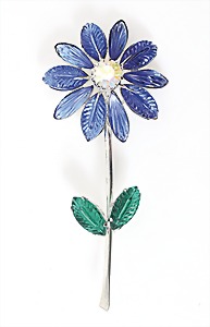 Brosche "BLUME", USA 1950/60er Jahre, weißfarben, signiert: WEISS; zentral opalisierender Strass, blau gravierte Blütenblätter, 2 grüne Blätter ca. 115 x 50 mm