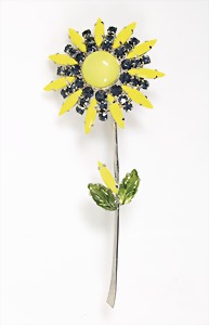 Brosche "BLUME", USA 1950/60er Jahre, weißfarben, signiert: WEISS; gelbe opake Blütenblätter mit dunklen Strasssteinen abgegrenzt, 2 grüne gravierte Blätter, ca. 113 x 48,2 mm
