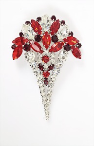 Brosche, "BLUMENVASE" USA 1950/60er Jahre, weißfarbenes Metall, signiert: WEISS, weiße u. rote Strasssteine, granatfarbene Akzente, L = 89,5 mm