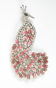 Brosche "PARADIESVOGEL" mit prächtigem Federkleid, PRICHARE Kaufbeuren Neu Gablonz 1950/60er Jahre, weißfarben, signiert: PCH; weißer Strass, weiß/rosa gravierte Blätter, ca. 107 x 55 mm, sehr dekorativ !