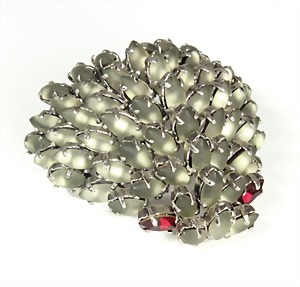 Brosche, "IGEL", PRICHARE Kaufbeuren Neu-Gablonz 1950/60er Jahre, weißfarbenes Metall, signiert: PCH, mondsteinfarbene Glassteine in Navette-Form, 2 rote Strasssteine als Augen, ca. 57,5 52,5 mm, die Steinfassungen sind schuppenartig hochgestellt u. der Körper stark gewölbt