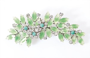 Große Brosche (pate de Verre) "BLÄTTERZAUBER", USA 1950/60er Jahre, weißfarben, signiert: WEISS; grün/weiß schillernde Blätter (graviert), Blüten mit grünem Cabochon u. weißem Strasskranz, L = 111,5 mm