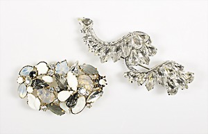 Lot: Broschen, USA 1950/60er Jahre, weißfarben/goldfarben, signiert: WEISS; 1 "WINTERZAUBER", weiße Strasssteine in Navett,-Tropfen u. Baguetteschliff, ca.90,5 x 38,5 mm; 1 weiß, opakes Glas in versch. Formen, mondsteinfarbenes graviertes Glas u. weißer Strass, ca. 68 x 41,5 mm