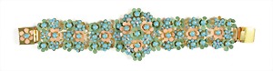 Armband, "BLÜTEN", USA 1950/60er Jahre, goldfarben, signiert: WEISS; grün u. rosafarbene Blüten besetzt mit türkisfarbenen Glascab. u. opalisierenden Strass, Kastenschloss, L = 18,5 cm