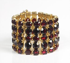 Armband, PRICHARE Kaufbeuren Neu-Gablonz 1950/60er Jahre, goldfarbenes Metall, signiert: PCH, drei Reihen rote 8-eckige Strasssteine, dazwischen Granatfarbenes Glas, untergebautes Kastenschloss, Sicherheitskettchen, L = 18,3 cm