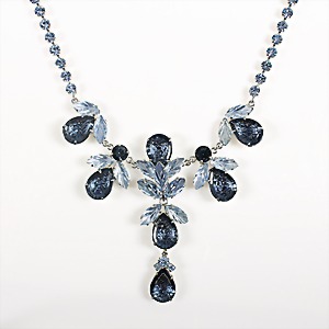 Collier "WINTER" in Blautönen, USA 1950/60er Jahre, weißfarbenes Metall, signiert: WEISS, gravierte Blätter u. Tropfen in versch. Blautönen, nach hinten hellblaue Strasssteine, Haken, L = 44,5 cm