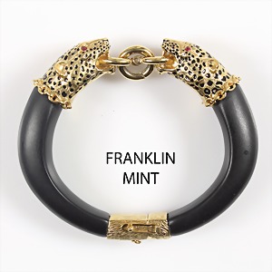 Exklusive Armspange von Franklin Mint 1987 (signiert FM 1987) mit 2 Panther-Köpfen. Eine Kopie des prunkvollen Armreifes der Herzogin von Windsor. Die Augen der Panther sind mit rubinfarbenen Steinen besetzt. Die Pantherköpfe u. die Ringe bzw. Zwischenelemente sind vergoldet mit 22K. Der Reif selbst ist aus fast schwarzem Ebenholz,. D innen = 66,5 x 55 mm