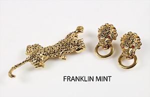 Lot: Ohrschmuck von Franklin Mint 1987 (signiert 89 FM) Ohrschmuck mit Panther-Köpfen H = 34,2 mm, die Augen der Panther sind mit rubinfarbenen Steinen besetzt, vergoldet mit 22K. t, passend dazu,1 Panther-Brosche, unsigniert, L = 84 mm, schwarze Emaillelackpunkte runden das Bild ab !