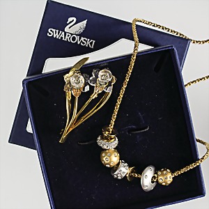 Lot: Collier u. Brosche von "SWAROWSKI", goldfarben, sig.: SAROWSKI u. Schwan (Symbol), Kette mit 7 Elementen, teilweise mit Strassbesatz, Klappschließe, L = 42 cm; Brosche "BLÜTEN" ca. 44 x 24,5 mm
