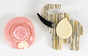 Lot: 2 Broschen von Lea Stein, "HUT" sig: LEA STEIN PARIS, aus laminiertem Cellulose-Acetat, Hut D = 38 mm; "ELEFANT" ca. 53 x 55,5 mm, Broschierung: Metall, L = 99,5 mm, Lea Stein wurde stark vom ART-DECO beeinflußt