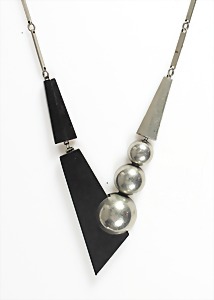 Collier, "ART-DECO" der 1930/40er Jahre, "BENGEL" idar-Oberstein, Metall platiniert, Meistermarke (unleserlich), schwarzer Bakelit, graphische Elemente (1/2 Kugeln u. Trapeze) verjüngen sich formschön zur Kette, L = 49 cm