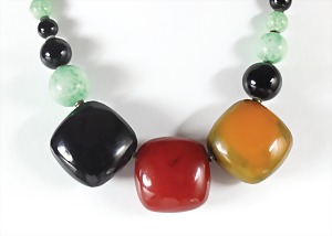 Collier, "ART-DECO" der 1930er Jahre, Metall, Galalitelemente (Kugeln u. weiche Kissenform), auf Metallkette gefädelt, rehschließe, vorne ca. 29,5 x 29,5 mm, L = 45 cm