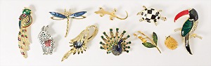 Lot Modeschmuck: 10 Broschen, 1 x Pfau sig.:SPHINX, Rest unsig. Igel, kl. Echse, Schildkröte, Libelle, Esel, Kakadu u. a.