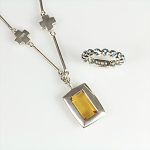 Lot: Silberschmuck 925/000, sig: "JOOP", Ring, umlaufend mit hellblauen Steinen (facettiert), RW ca. 54,5; Collier mit citrinfarbenem Anhänger, L = 44 cm,