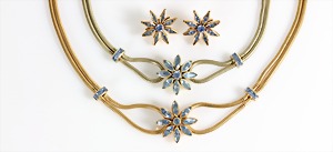 Lot Modeschmuck, goldfarbenes Metall, blaue Blumenrosetten, 1 Collierkette L = 44,5 cm; 1 Armband L = 18 cm, die doppelten Bänder werden durch kleine ausgefasste Stege zusammengehalten; 1 Paar Ohrclips, D = 20,5 mm