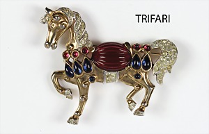 "ZIRKUS-PFERD", dekorative Brosche von "TRIFARI" 1950er Jahre, goldfarbenes Metall, sig.: TRIFARI, weiße Strasssteine, farbiges Glas, schwer gearbeitet, Maße: ca. 55,5 x 47,5 mm, ausdrucksvolles Stück !