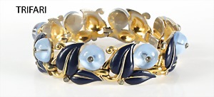 Dekoratives Armband von "TRIFARI" 1950er Jahre, goldfarbenes Metall, sig.: TRIFARI, Blätter mit dkl. Blauem Emaillelack, hellblaues Glas mit weißem Strass besetzt, farbiges Glas, untergebautes Kastenschloss, B = 18 mm, L = 18,0 cm, ausdrucksvolles Stück !