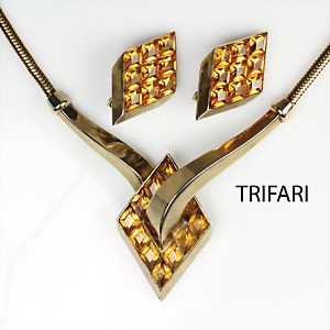 Lot: Collier u. Ohrclips von "TRIFARI" 1950er Jahre, goldfarbenes Metall, sig.: TRIFARI, beide Stücke mit rautenförmigem Strassbesatz, in orange ! Collier, L = ca. 38 cm; Ohrclips räumlich gestaltet, ca. 22 x 37 mm, ausdrucksvolle Stücke !
