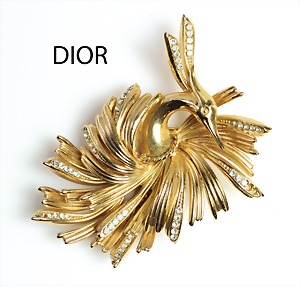 Brosche "PARADISVOGEL" von "DIOR", Metall: goldfarben, sig: Chr. Dior, weißer Steinbesatz, ca. 45 x 61 mm