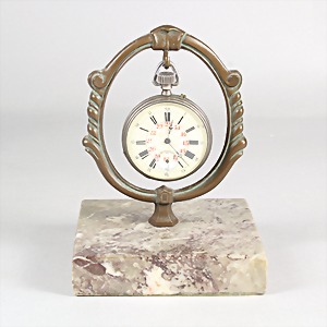 Taschenuhrenständer 1.Hälfte 20.Jhd., Marmorsockel mit brüniertem Metallständer, H = 12,5 cm, Sockel 9,3 x 9,8 mm; Herren-Zylindertaschenuhr, Metallgehäuse, cremefarbenes Emailleziffernblatt, röm. Zahlen u. Strichindex, kl.Sek. auf 6 Uhr, D = 46,3 mm, Uhr läuft !