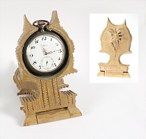 Schatulle/Ständer für Taschenuhr, Graviert; "St. Gallen", Holz, 2.Hälfte 19.Jhd., geschnitztes Edelweißmotiv, Aussparung für Taschenuhr D = 53 mm, H = 12 cm; Herren-Zylindertaschenuhr, "ALPINA", Silber 800/000, weißes Emailleziffernblatt mit arab. Zahlen, feine goldene Zeiger, kl. Sek. Auf 6 Uhr, D = 48,2 mm, Uhr läuft !