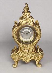 Kleine Tischuhr um 1900 im Stil LUDWIG XlV., goldfarbenes Gehäuse, arab. Zahlen, 1 Tagewerk, H = 20,5 cm, Uhr läuft !