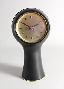 Kleine Tischuhr "VINTAGE",1950er Jahre, Quarz, schwarzes Bakelit Gehäuse (SWISS MADE), Zentralsek., Strichindex, H = 24,5 cm, Uhr läuft !