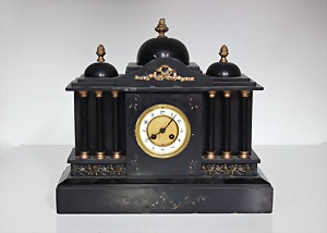 Kaminuhr, Frankreich um 1850/70, schwarzer Marmorgehäuse, Emailleziffernblatt mit arab. Zahlen, (Glasabdeckung fehlt), 1/2 Sdt. Schlag auf Draht, 6 Säulen mit goldfarbenen Sockeln u. Kapitellen, Vögel-Applikationen, 3 Kuppeln mit aufgesetzten Zapfen, B = 45,0, H = 40,0 T = 15,0 cm, Uhr läuft !