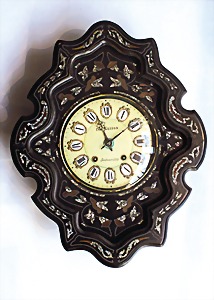 Wanduhr, Frankreich Mitte 19.Jhd. "PAUL MASSON" BODONVILLER, Holzgehäuse mit Perlmutter - u. Holzintarsien, gelbes Emaille-Ziffernblatt mit abgesetzten röm. Zahlen (weiß emailliert), Eisenplatine, 1/2 Std. Schlag auf Feder, ca. 65 x 52 cm