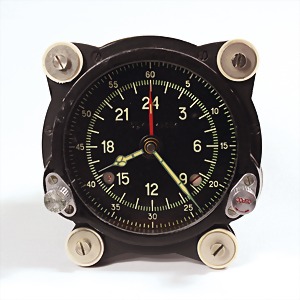 Russische EINBAUBORDUHR (MILITÄR) aus den 1990er Jahren, Metallgehäuse, verschraubtes Mineralglas, Kontrastziffernblatt, 8-Tage Gangreserve, 24 Std-Zeitanzeige; große monomentallische Unruh, Kal.: 66970, Heizungsabschluß (27 Volt), D = ca. 90 mm