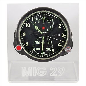 Russische Einbau BORDUHR UDSSR aus den 1980/90er Jahren, für "MIG 29", Doppelchronograph, Metallgehäuse, hermetisch verschraubtes Mineralgla, Kontrastziffernblatt, 2-Tage Gangreserve, 60 Min. u. 12 Std. Stoppzeit, Stoppbereitschaftsanzeige, Heizungsabschluß, montiert auf Plexiglasständer mit Gravur: MIG 29, Uhr läuft !