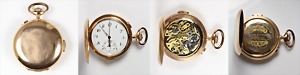 Sprungdeckel Herrentaschenuhr, "REPETITION u. CHRONOGRAPH" um 1900/05, GG, 56 Zolotnik (585/000) für russischen Markt hergestellt, sehr gut erhaltenes weißes Emaillezifferblatt, arab. Zahlen, feine goldene Zeiger, Stoppuhr mit Schlag auf Feder (1/4 u. Std. Schlag), Std./Minutenzeiger lassen sich nicht Stellen, Staubdeckel GG 585/000, Werkabdeckung (Glas) fehlt ! D = 56,5 mm, total 120,1 g, Uhr läuft nicht ab !