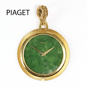 Damen-Taschenuhr "PIAGET" Schweiz 1970/80iger Jahre, Handaufzug, GG 750/000, sig.: PIAGET, goldene Zeiger, Jade/Jadeit Ziffernblatt, Kal.: 9 B, ausgefallene Schlaufe, D = 43 mm, Uhr läuft ! ausgefallene Schmuckuhr !